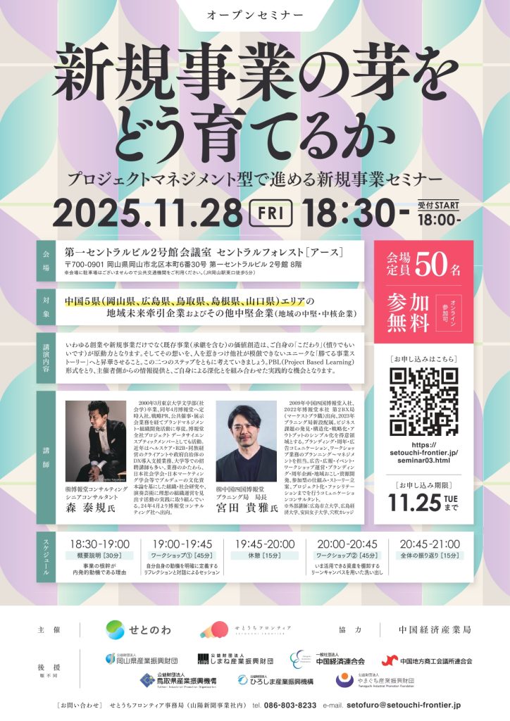 ちゅうぎんフィナンシャルグループの地域商社・株式会社せとのわ(本社:岡山市北区本町、代表取締役:太田実)は11月28日(金)、地域の中堅・中核企業の新規事業構築につなげるイベント「新規事業の芽をどう育てるか〜プロジェクトマネジメント型で進める新規事業セミナー」を開催します。広告大手の博報堂グループから講師を招き、作業を通じて知見を深めます。